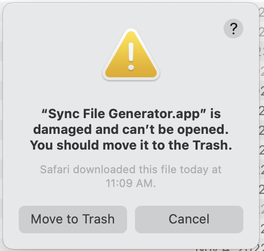 Short description of the issue: When attempting to run Sync File Generator.app from /Applications, I get the error "Sync File Generator.app" is damaged and can't be opened. You should move it to the trash."