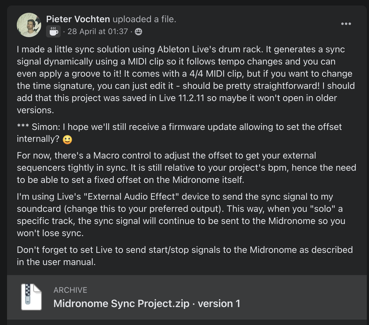 Hmmm. Any chance you could share the Ableton sync device on this forum? I deleted my FB account and I'm not keen to go back...