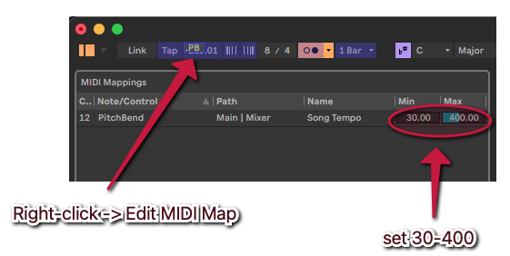 • Change the Min/Max to match the Nome (30-400) and exit the MIDI mapping mode