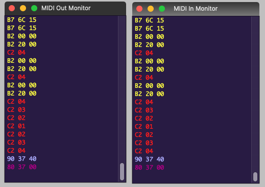 The yellow messages are CC, the "B2" messages are the MSB/LSB of the PC message, and the "C2" messages are the actual PC messages. 90 and 80 are MIDI notes - just to test. Point is, everything is transmitted correctly.