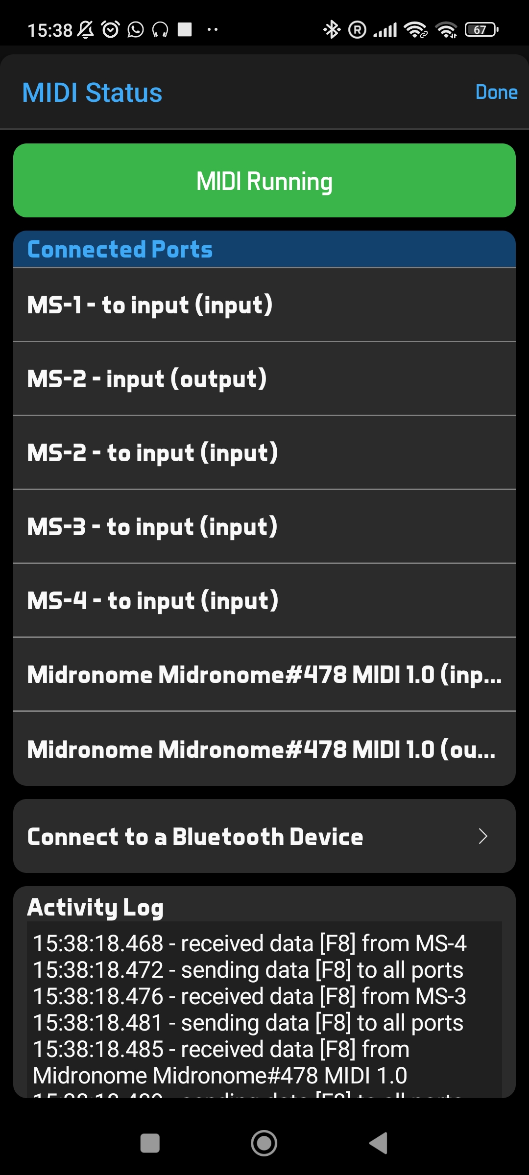 The screenshots are from different devices, both Android, one from tablet that works normally with Midronome but doesn't 'see' all the ports (and consequently doesn't manage to get the program change to work), and other from phone that 'sees' more ports but the BandHelper app freezes after starting MIDI.